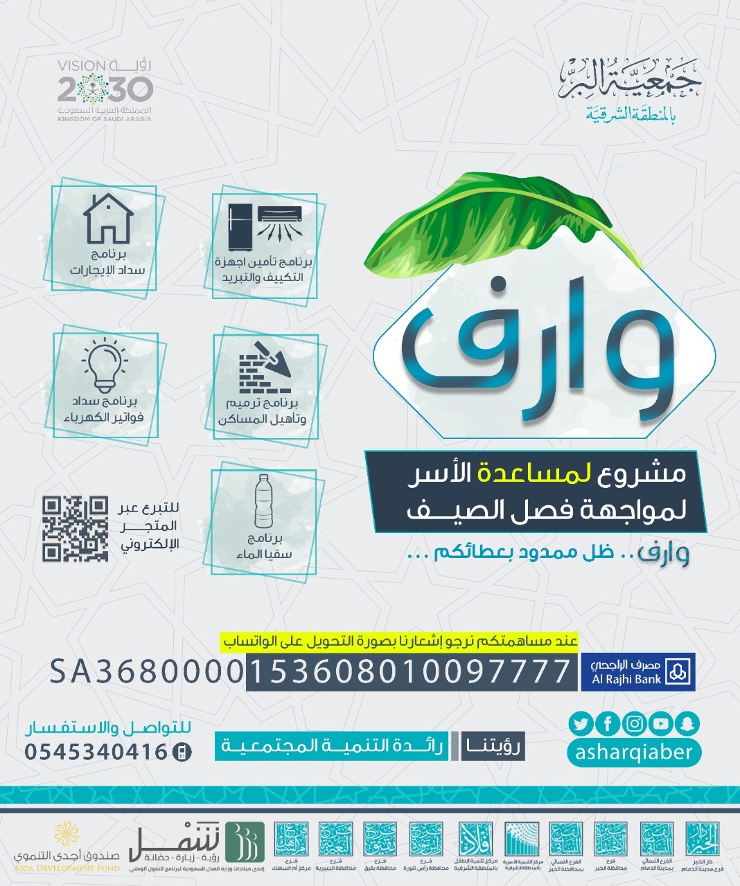 أطلقت جمعية البر بالمنطقة الشرقية اليوم حملة "وارف" على وسائل التواصل الاجتماعي لتوفير احتياجات الصيف للأسر الأشد حاجة بالمنطقة الشرقية.