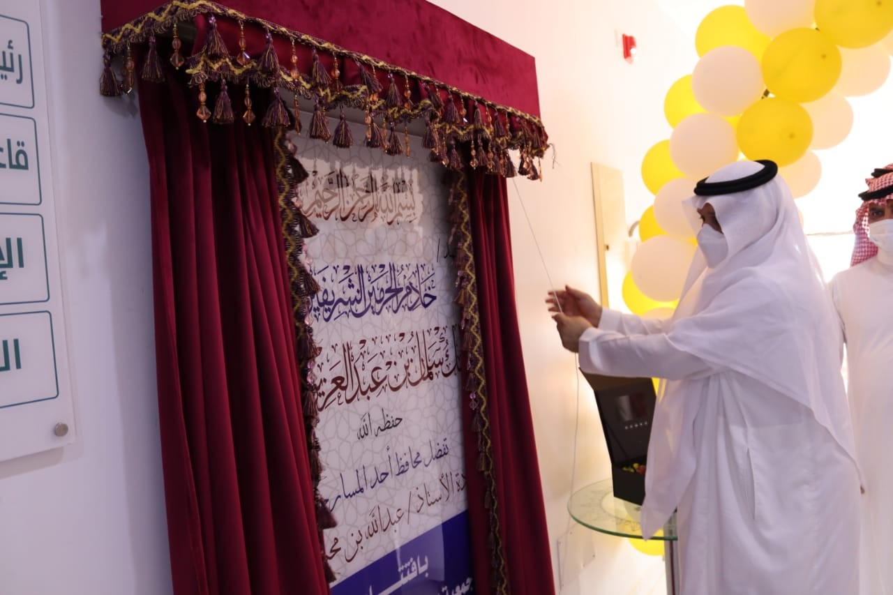 وفور وصول سعادته لمقر الجمعية الجديد على طريق احد المسارحة ابو عريش قام بازاح الستار إيذاناً بافتتاح المبنى.