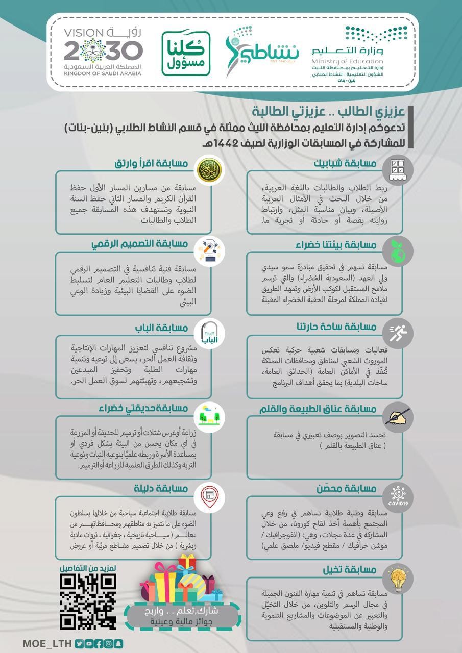 دعت إدارة التعليم بمحافظة الليث ممثلة بإدارتي النشاط الطلابي "بنين- بنات" الطلاب والطالبات في مختلف المراحل التعليمية للمشاركة في برنامج النشاط الصيفي "نشاطي" للعام ١٤٤٢هـ ، الذي أطلقته وزارة التعليم ؛لتعزيز القيم الوطنية والتربوية المتحققة في الأنشطة الطلابية ، من خلال عدد من المسابقات والأنشطة والمشروعات الصيفية .