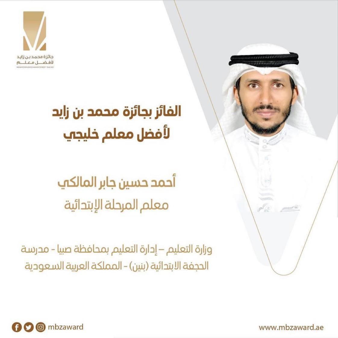 هنأ صاحب السمو الملكي الأمير محمد بن ناصر بن عبدالعزيز أمير منطقة جازان وزارة التعليم وإدارة تعليم صبيا بتحقيق مرشح المملكة المعلم أحمد حسين جابر المالكي من مكتب تعليم الداير جائزة الشيخ محمد بن زايد لأفضل معلم في دورتها الثالثة، مؤكدا أن هذه المنجزات المتتالية التي يحققها أبناء وبنات المملكة تأتي بفضل الله ثم الدعم الكبير من قيادة هذه البلاد المباركة، كما ثمن سمو أمير منطقة جازان جهود إدارة تعليم صبيا المتميزة في تطوير العملية التعليمية وسعيها لرفع أداء المعلمين والمعلمات وذلك وفقا لرؤية المملكة ٢٠٣٠.