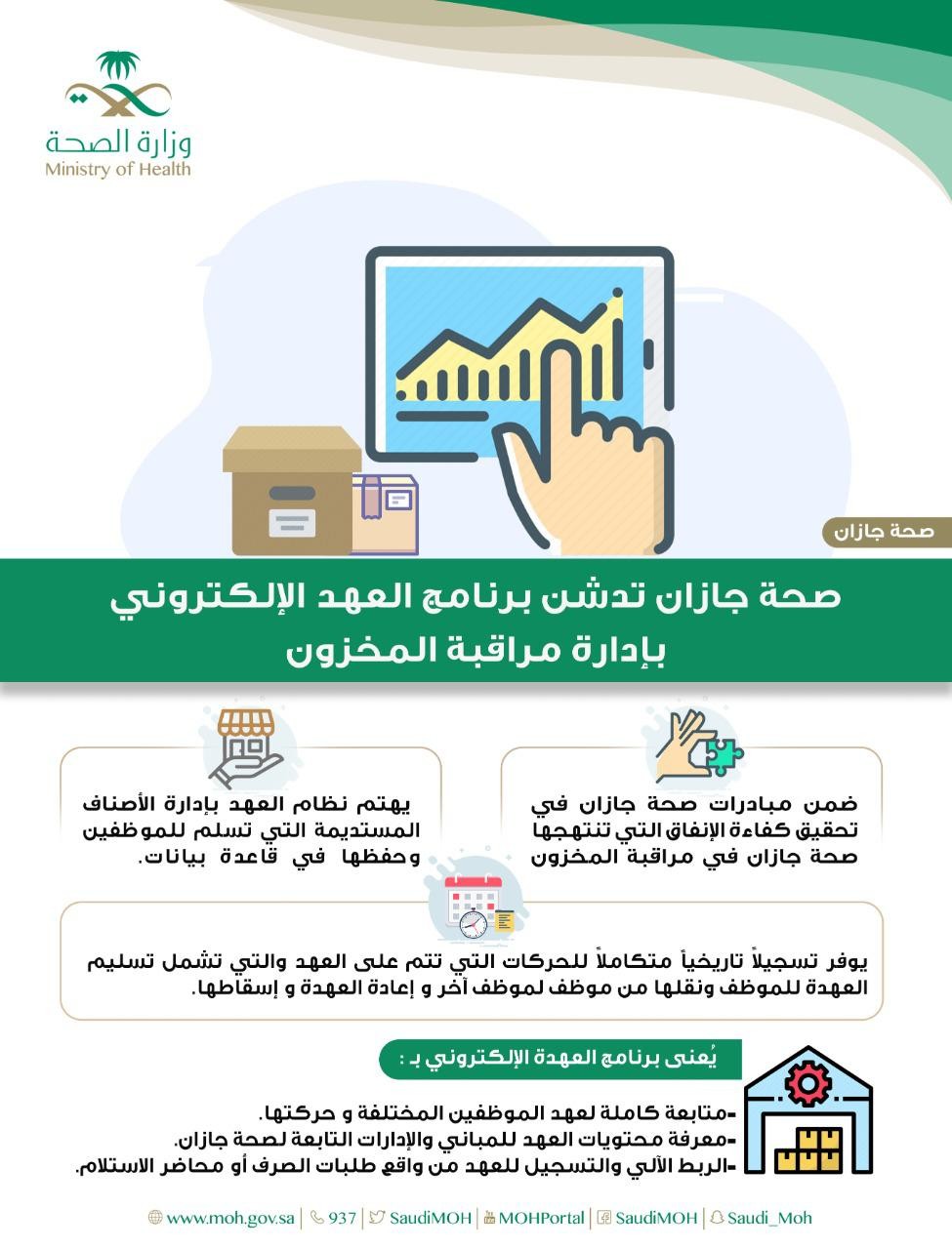 وقد ذكر مساعد مدير صحة جازان للشؤون الإدارية والمالية بصحة جازان الأستاذ سعيد بن محمد الأحمري بأن هذا البرنامج ضمن مبادرات صحة جازان في تحقيق كفاءة الانفاق التي تنتهجها صحة جازان في مراقبة المخزون حيث يهتم نظام العهد بإدارة الأصناف المستديمة التي تسلم للموظفين وحفظ ذلك في قاعدة بيانات للعهد والموظفين المستلمين لها كما يوفر تسجيلاً تاريخياً متكامل للحركات التي تتم على العهد والتي تشمل تسليم العهدة للموظف ونقلها من موظف لموظف آخر، وإعادة العهدة وإسقاط العهدة.