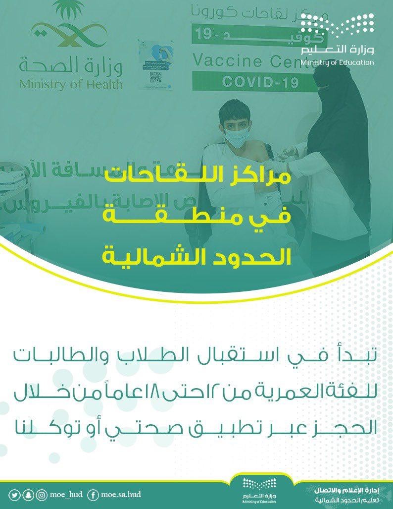 حيث وضحت مراكز اللقاحات في منطقة الحدود الشمالية بإن المراكز تبدأ في استقبال الطلاب والطالبات للفئة العمرية من ١٢ حتى ١٨ عاماً من خلال الحجز عبر تطبيق صحتي أو توكلنا