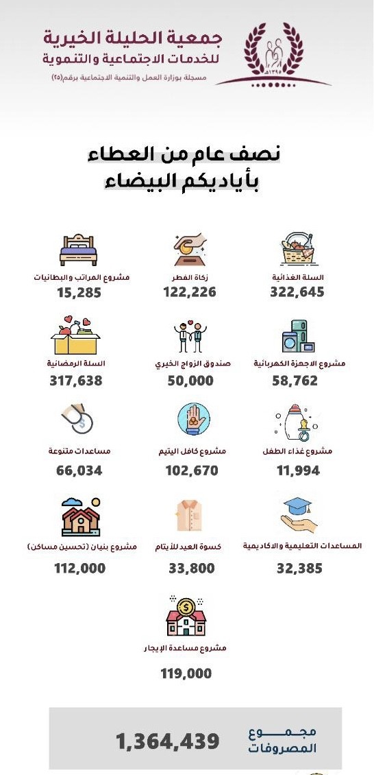 إنفاق جمعية الحليلة يفوق مليون وربع خلال النصف الأول لعام 2021
