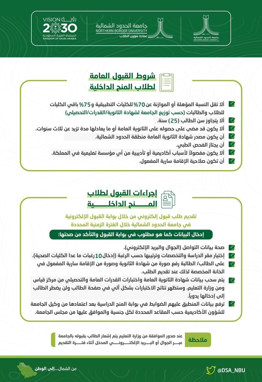 أعلنت جامعة الحدود الشمالية عن فتح بوابة القبول الإلكترونية للمنح الدراسية الداخلية للطلبة غير السعوديين للعام الجامعي 1443هـ، ابتداءً من اليوم الأحد 24 / 11 / 1442هـ ولمدة أسبوع للتسجيل، والاطلاع على شروط وإجراءات القبول على الرابط التالي https:cutt.usrJOcg.