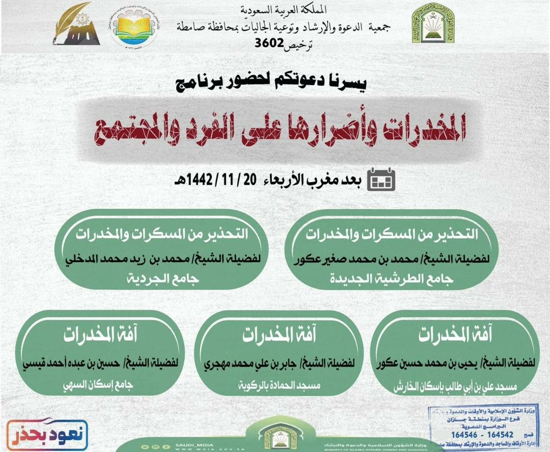 وزارة الشؤون الإسلامية والدعوة والإرشاد ممثلة بفرعها في منطقة جازان وبالتعاون مع جمعية الدعوة والإرشاد وتوعية الجاليات بمحافظة صامطة البرنامج الدعوي التوعوي المصاحب لليوم العالمي لمكافحة المخدرات (المخدرات وأضراراها على الفرد والمجمتع ) الذي انطلق بعد مغرب يوم الأربعاء العشرون من شهر ذي القعدة 1442 هجرية في عدد من الجوامع والمساجد حيث شارك فيه نخبة من المشايخ الفضلاء يتحدثون عن عدة مواضيع هامة كالتحذير من المسكرات وآفة المخدرات .