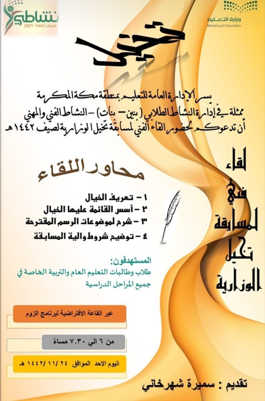 نظمت الإدارة العامة للتعليم بمكة المكرمة ممثلة بإدارة النشاط الطلابي ( بنين - بنات) - المجال الفني والمهني - اللقاء الأول لمسابقة تخيل لصيف نشاطي1442 هـ، حضر اللقاء طلاب وطالبات تعليم مكة المكرمة للمشاركة في المسابقة.