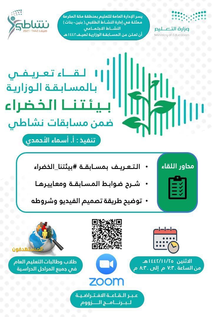 النشاط الطلابي بتعليم مكة يعقد اللقاء التدريبي لمسابقة بيئتنا الخضراء لصيف نشاطي 1442هـ