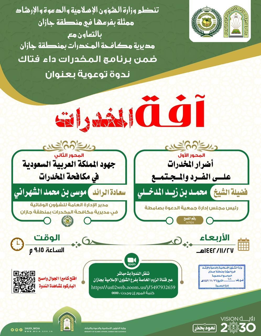 تنظم وزارة الشؤون الإسلامية والدعوة والإرشاد ممثلة بفرعها في منطقة جازان وبالتعاون مع المديرية العامة لمكافحة المخدرات مساء اليوم الأربعاء السابع والعشرون من شهر ذي القعدة ١٤٤٢ هجرية الندوة العلمية التوعوية آفة المخدرات،والتي ستبث عبر برنامج الزوم الخاص بفرع وزارة الشؤون الإسلامية في جازان عند الساعة التاسعة وعشر دقائق مساءاً .
