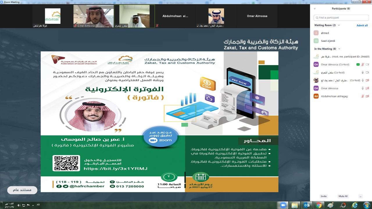نظمت غرفة حفرالباطن بالتعاون مع اتحاد الغرف السعودية وهيئة الزكاة والضريبة والجمارك اليوم الأربعاء السابع من يوليو 2021م، ورشة عمل افتراضية حول الفوترة الإلكترونية، قدمها الأستاذ عمر بن صالح الموسى من مشروع الفوترة الإلكترونية "فاتورة".
