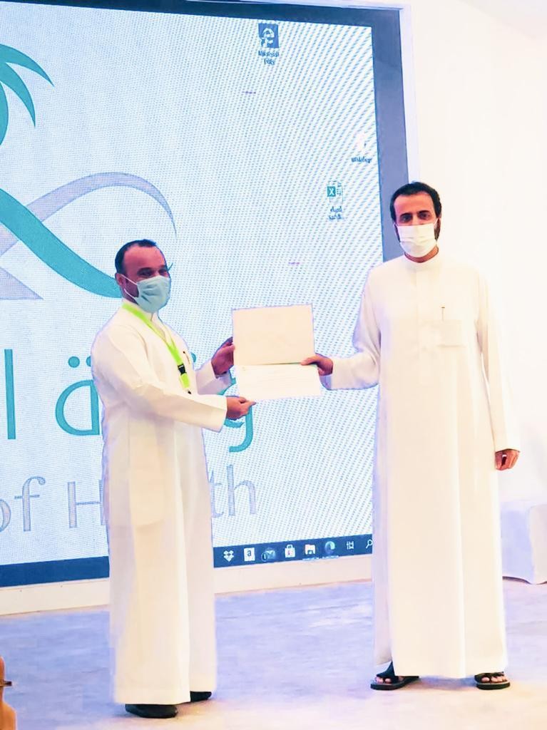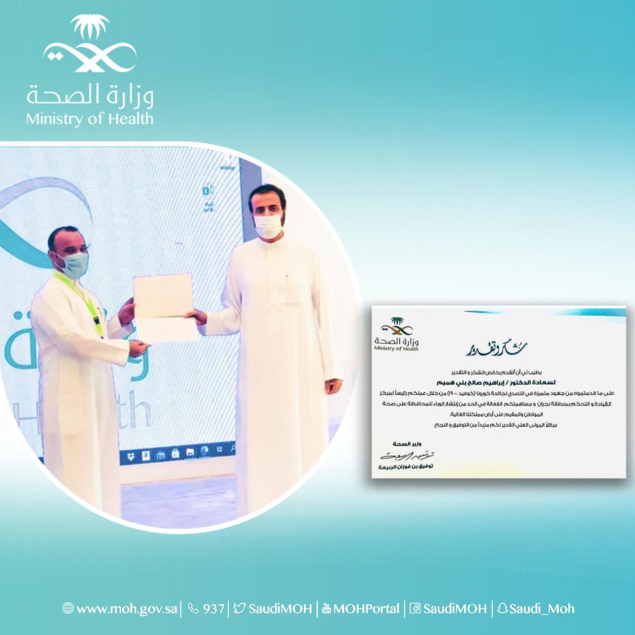 كرم معالي وزير الصحة الدكتور توفيق الربيعة سعادة مدير عام صحة نجران الدكتور إبراهيم صالح بني هميم لجهوده المتميزة في التصدي لجائحة كورونا من خلال عمله رئيساً لمركز القيادة والتحكم بمنطقة نجران ومساهمته الفعالة في الحد من انتشار الجائحة