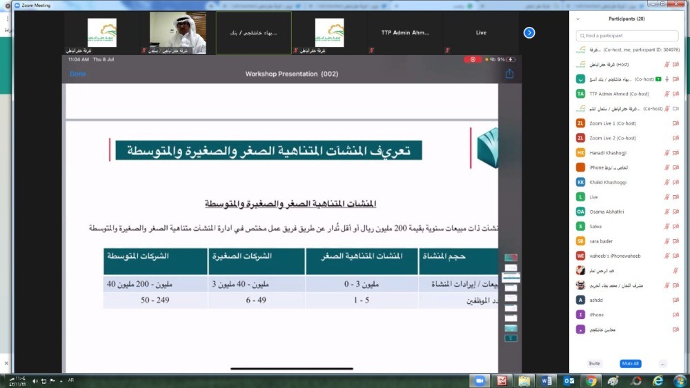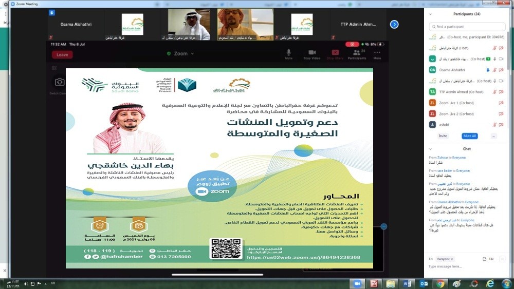 نظمت غرفة حفرالباطن، محاضرة افتراضية عبر منصة zoom  بعنوان "دعم وتمويل المنشآت الصغيرة والمتوسطة" بالتعاون مع لجنة الإعلام والتوعية المصرفية بالبنوك السعودية، قدمها رئيس مصرفية المنشآت الناشئة والصغيرة والمتوسطة في البنك السعودي الفرنسي، الأستاذ بهاء الدين خاشقجي.