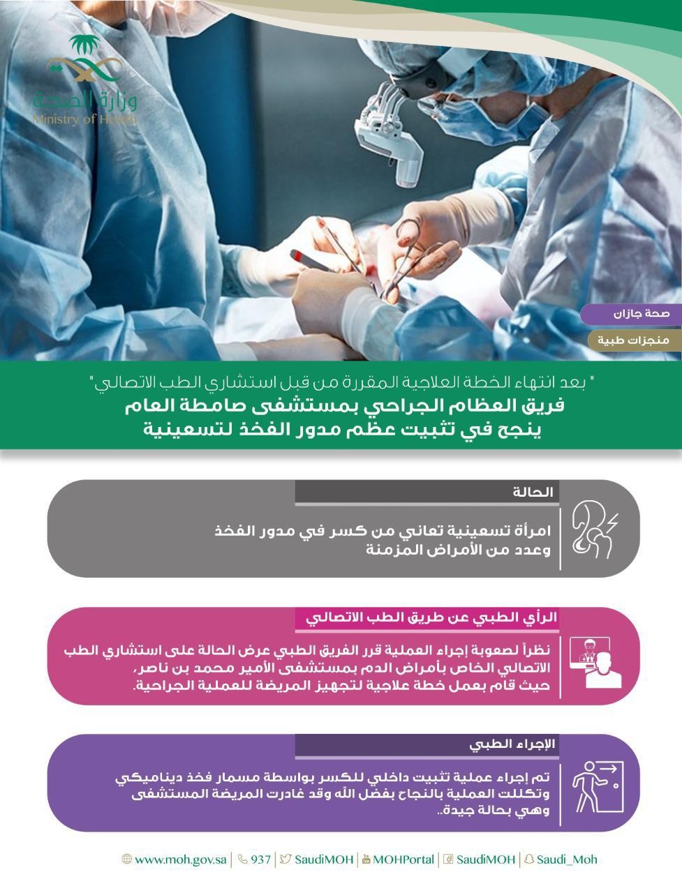 فريق العظام الجراحي بمستشفى صامطة العام ينجح في تثبيت عظم مدور الفخذ لتسعينية