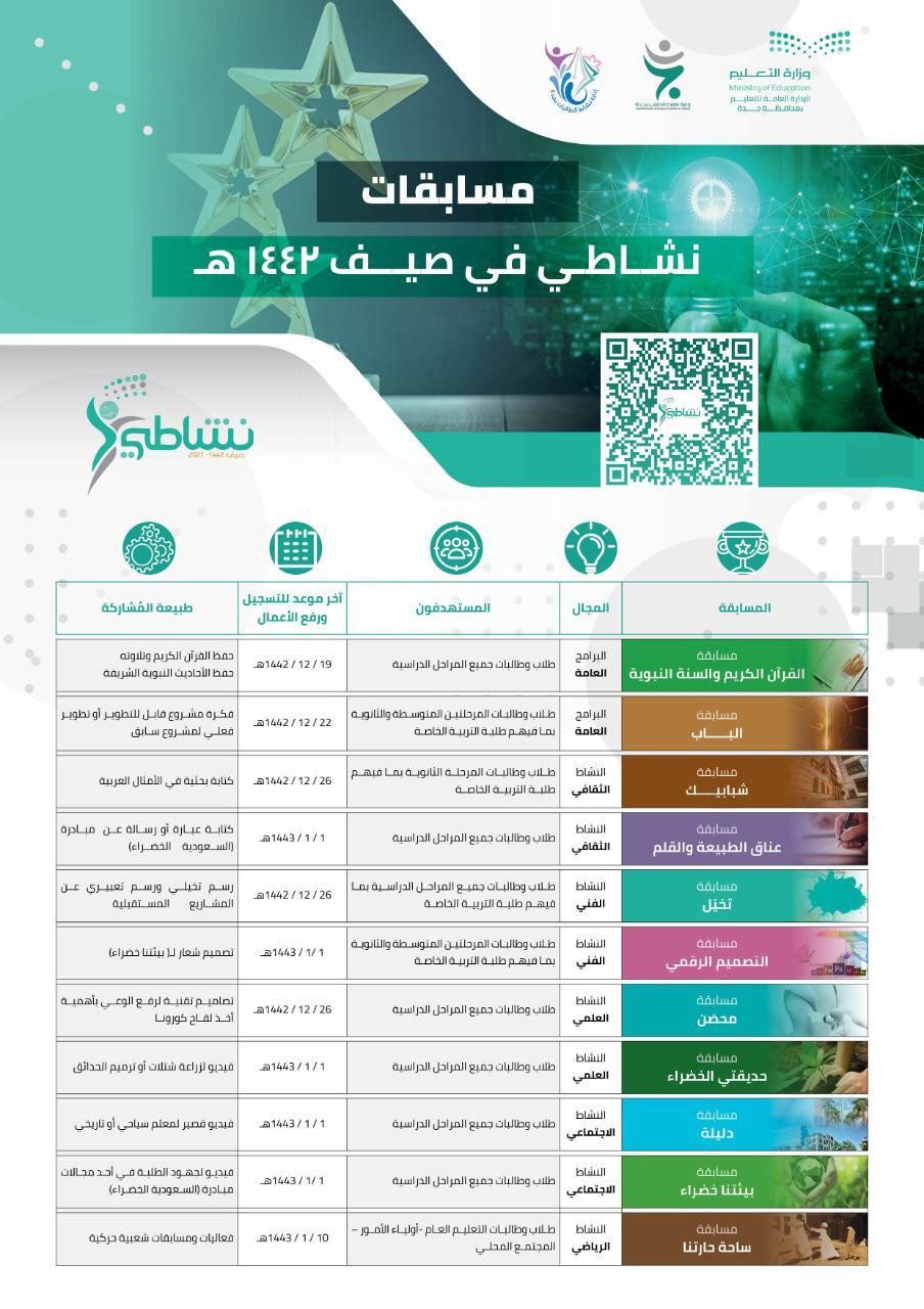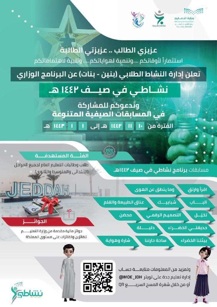 يشهد برنامج النشاط الصيفي "نشاطي" للعام 1442هـ؛ الذي أطلقته وزارة التعليم مؤخراً، اقبالاً ومشاركة متزايدة من طلاب وطالبات تعليم جدة، حيث تتلقى إدارتي النشاط الطلابي (بنين - بنات) المشاركات في مختلف المسابقات والأنشطة والمشروعات الصيفية، وفق الخطة الزمنية المحددة، تمهيداً لعمية الفرز والتحكيم ومن ثم رفع الأعمال المرشحة للتصفيات النهائية على مستوى المملكة، لوكالة التعليم العام ممثلة في النشاط الطلابي.