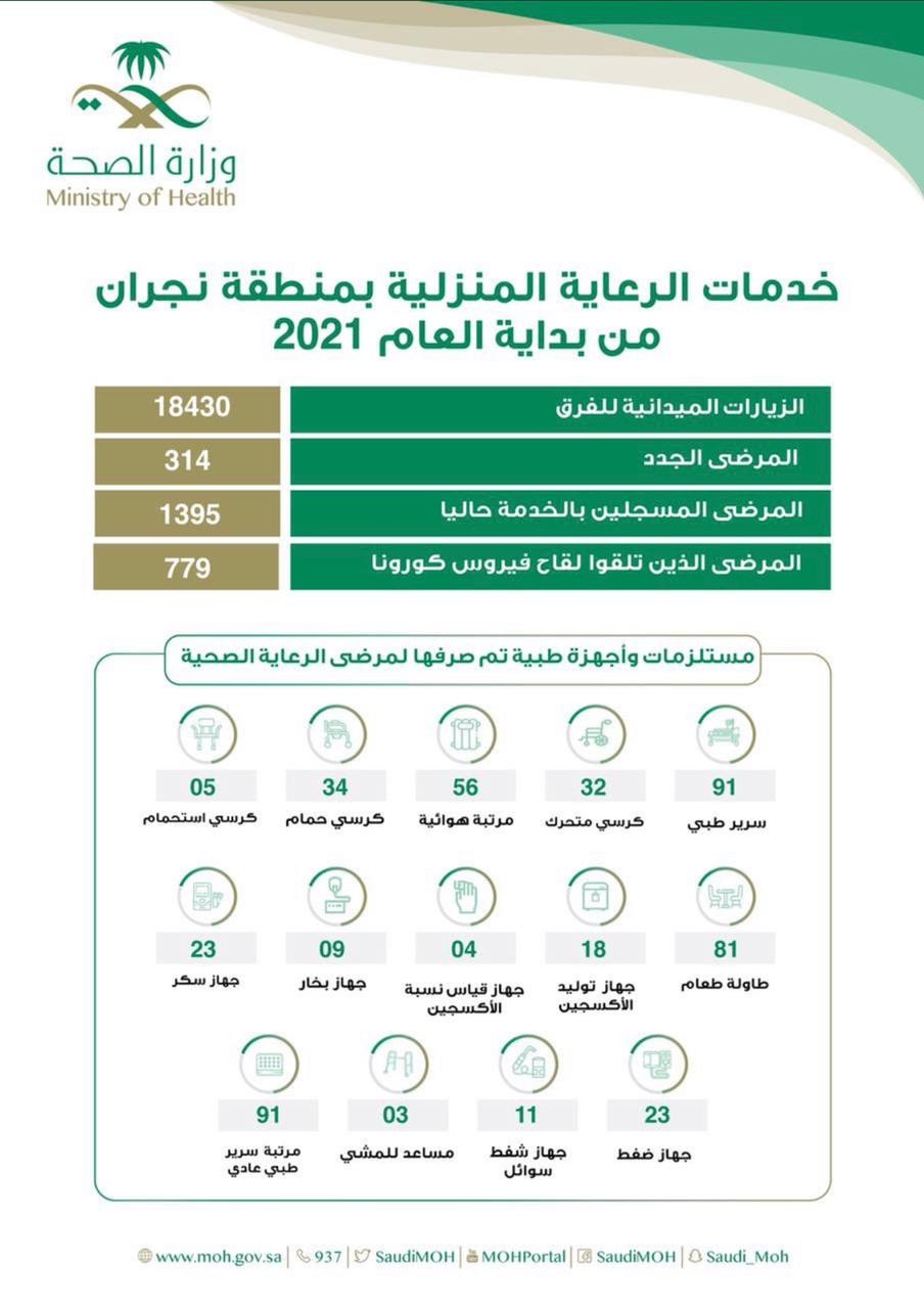 نفّذت صحة نجران 18430 زيارة للمرضى في منازلهم عبر خدمات برنامج الرعاية المنزلية وذلك خلال النصف الأول العام الحالي 2021م ، حيث إستفاد منها 1709 مرضى من المرضى المسجلين في البرنامج ، وذلك عبر 8 مستشفيات هي مستشفى الملك خالد ، و نجران العام الجديد ومستشفى الولادة والأطفال ، و شرورة العام ، و حبونا العام ، وبدر الجنوب العام، و خباش العام ، و مجمع إرادة والصحة النفسية.