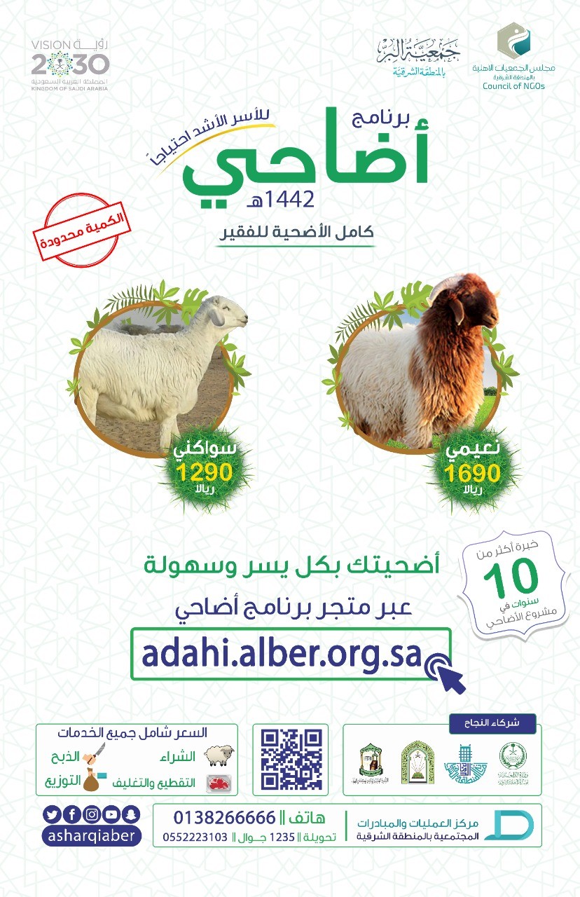 يذكر أن جمعية البر بالمنطقة الشرقية تنفذ سنويا برنامج  أضاحي لإحياء شعيرة الأضحية والتيسير على المضحي في أداء الشعيرة .
