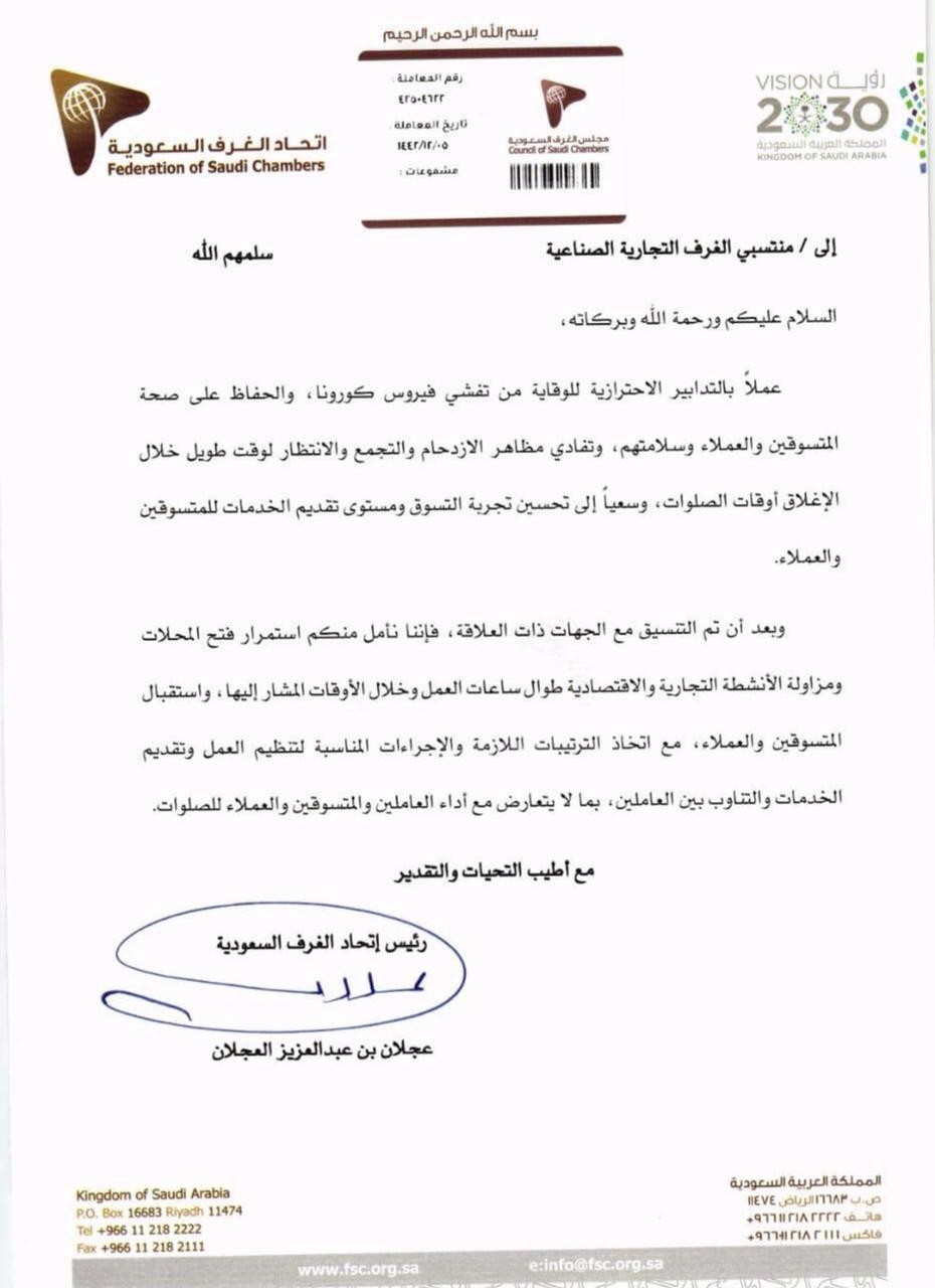 أصدر اتحاد الغرف السعودية (الخميس) تعميما وجه فيه باستمرار فتح المحلات، ومزاولة الأنشطة التجارية والاقتصادية طوال ساعات العمل، وأضاف اتحاد الغرف السعودية بأنه تفادياً لمظاهر الازدحام و التجمع، و الانتظار لوقت طويل والعمل بالتدابير الوقائية من فايروس كورونا وللحفاظ على صحة المتسوقين نهيب بأصحاب المحلات والأنشطة التجارية باستمرار فتح المحلات خلال أوقات الصلوات. وأوضح «اتحاد الغرف» أن ذلك يأتي لتحسين تجربة التسوق بالتنسيق مع الجهات ذات العلاقة، مؤكدا على اتخاذ الإجراءات المناسبة لتنظيم العمل، وتقديم الخدمات والتناوب بين العاملين، بما لا يتعارض مع أداء العاملين والمتسوقين والعملاء للصلوات.
