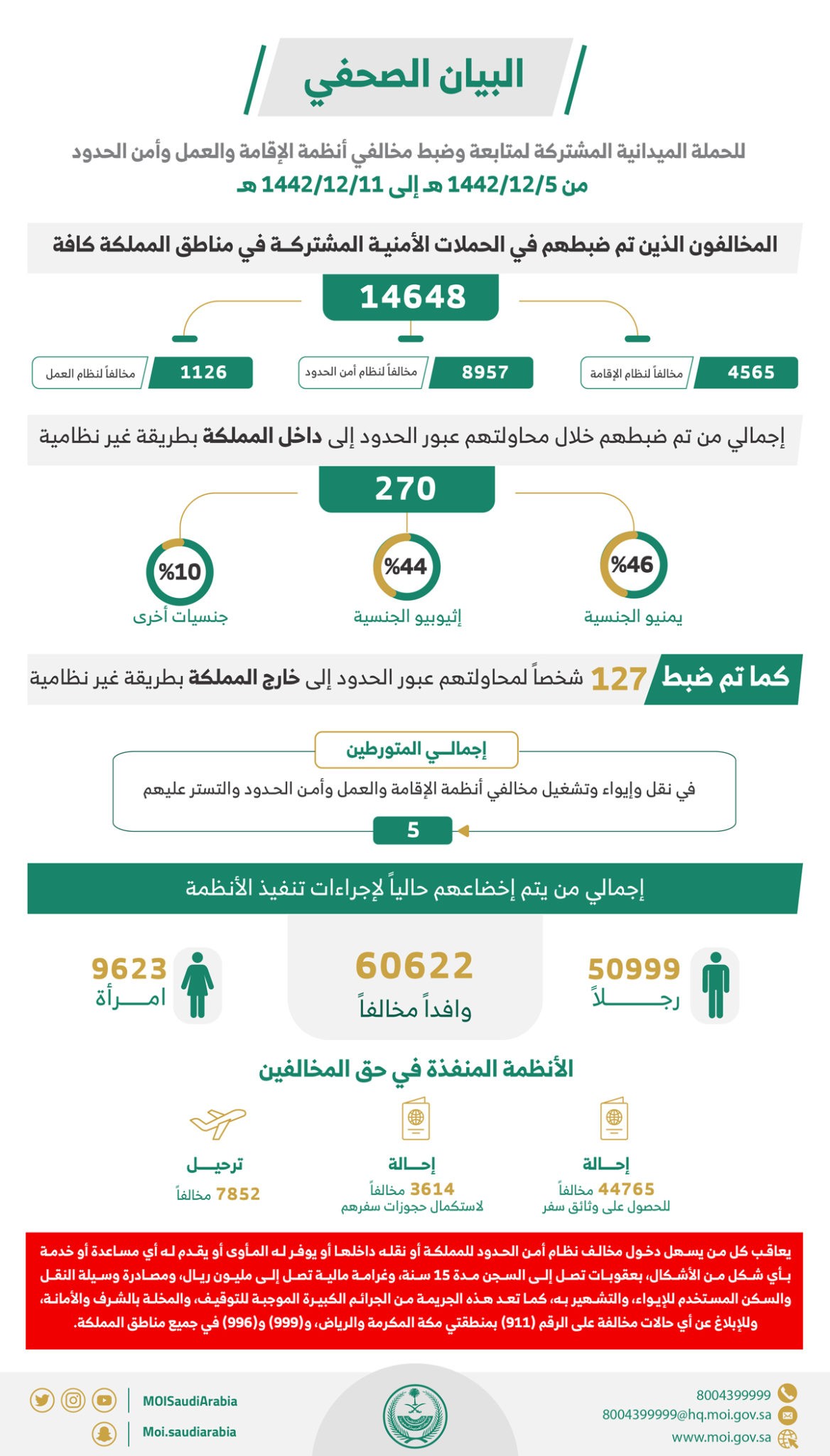 أسفرت الحملات الميدانية المشتركة لمتابعة وضبط مخالفي أنظمة الإقامة والعمل وأمن الحدود، التي تمت في مناطق المملكة كافة، وذلك للفترة من 5 / 12 / 1442 هـ الموافق 15 / 7 / 2021 م حتى 11 / 12 / 1442هـ الموافق 21 / 7 / 2021م، عن النتائج التالية : –