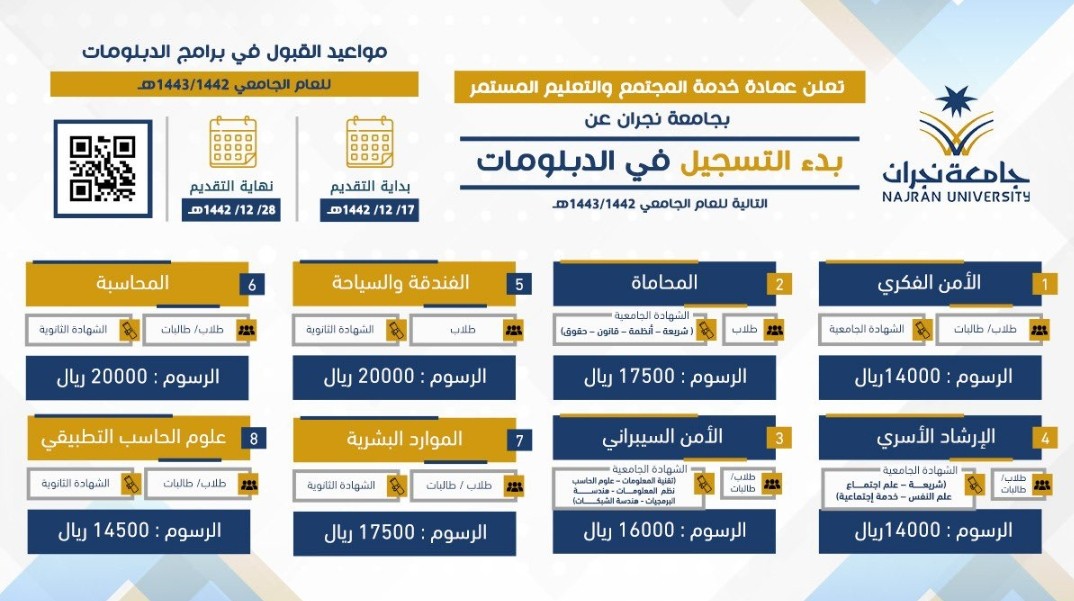 وتشمل الدبلومات العالية " الأمن الفكري، والمحاماة، والأمن السيبراني، والإرشاد الأسري، ويُشترط على الراغبين في الالتحاق بها الشهادة الجامعية المرتبطة بكل تخصص، فيما تشمل الدبلومات المتوسطة دبلوم المحاسبة، والفندقة والسياحة، وعلوم الحاسب التطبيقي، والموارد البشرية، ويُشترط في التقديم عليها الشهادة الثانوية فقط.
