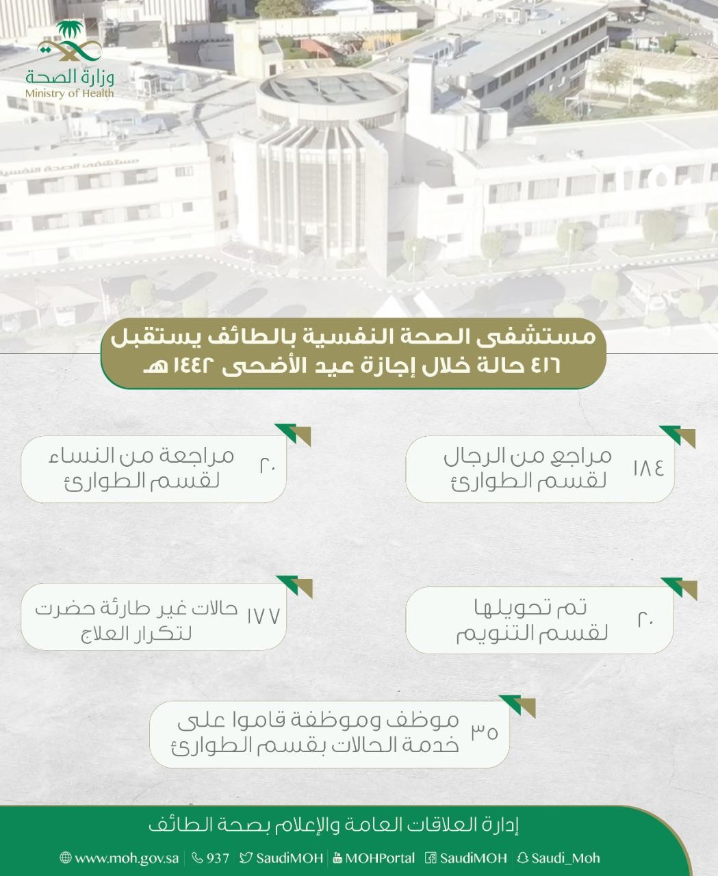 استقبلت طوارئ مستشفى الصحة النفسية بالطائف 416 حالة خلال اجازة عيد الاضحى المبارك لهذا العام تنوعت ما بين حالات طارئة بلغ عددها 184 حالة رجال و 23 حالة نساء وتم تنويم 20 حالة رجال وحالتي نساء وحالات غير طارئة حضرت لتكرار العلاج خلال الإجازة بلغ عددها 115 حالة رجال و 62 حالة نساء.