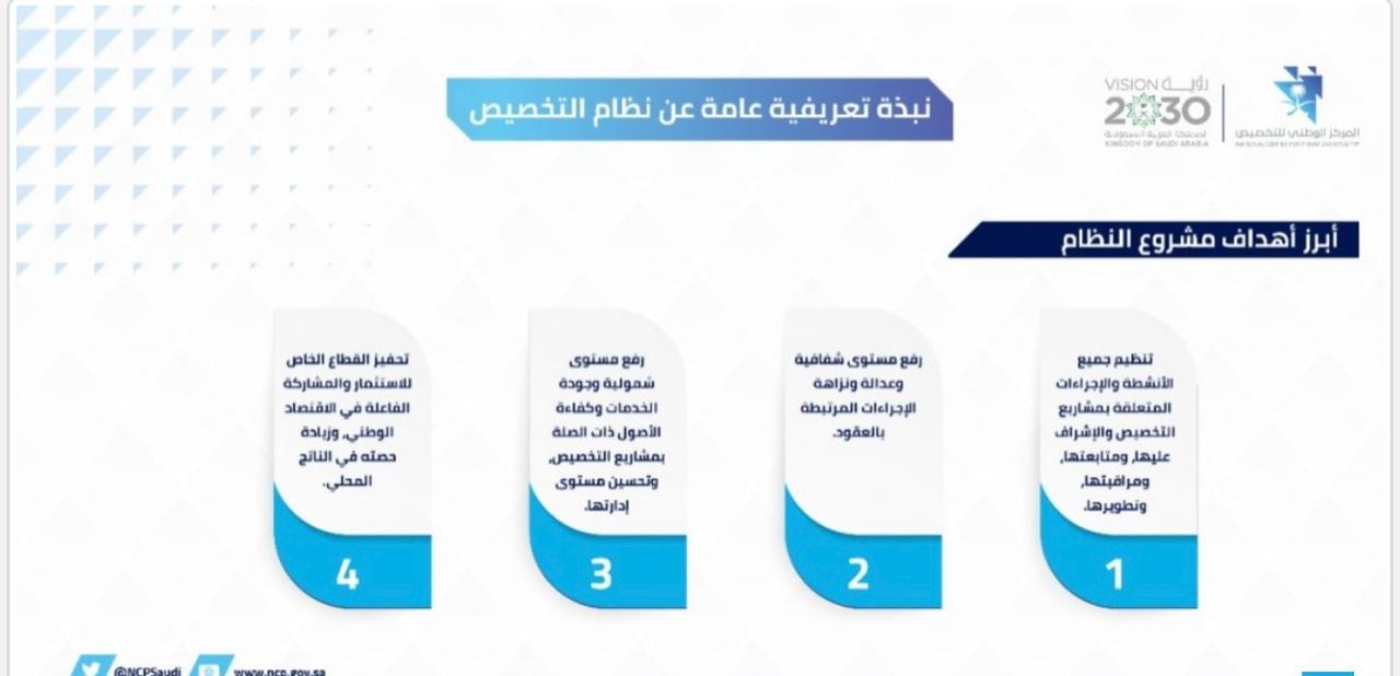 تعزيز مشاركة القطاع الخاص في الاقتصاد وإتاحة الفرص الاستثمارية أمامه، من خلال تنظيم الإجراءات المُتعلقة بمشاريع التخصيص وتسهيل تقديم تلك الفرص للقطاع الخاص بشكل شفاف وعادل ونزاهة الإجراءات المرتبطة بالعقود، ورفع مستوى شمولية وجودة الخدمات وكفاءة الأصول ذات الصلة بمشاريع التخصيص، وتحسين مستوى إدارتها.