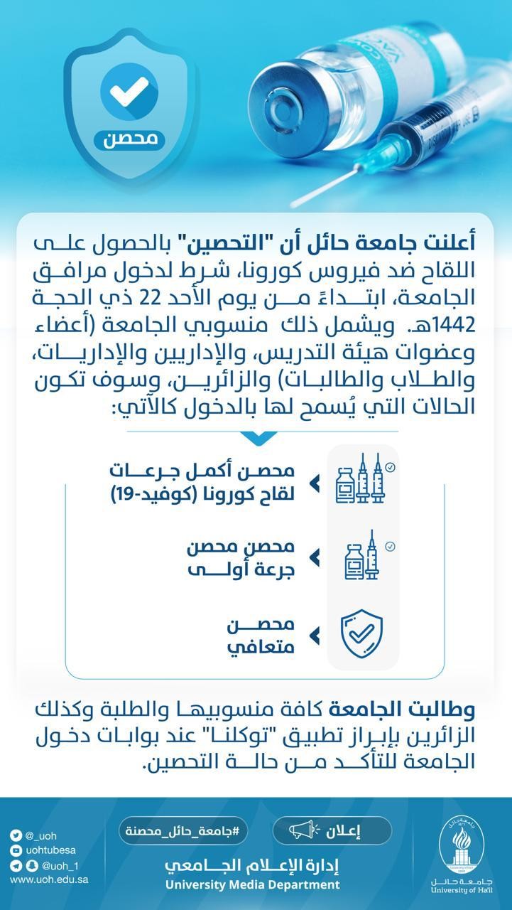 أعلنت جامعة حائل أن “التحصين” بالحصول على اللقاح ضد فيروس كورونا، شرط لدخول مرافق الجامعة، ابتداءً من يوم الأحد 22 ذي الحجة 1442هـ. ويشمل ذلك منسوبي الجامعة (أعضاء وعضوات هيئة التدريس، والإداريين والإداريات، والطلاب والطالبات)، والزائرين، وسوف تكون الحالات التي يُسمح لها بالدخول كالآتي: