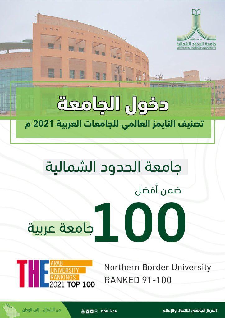 حصلت جامعة الحدود الشمالية على الترتيب ال٩١ ضمن قائمة أفضل ١٠٠ جامعة حسب تصنيف التايمز للجامعات العربية.