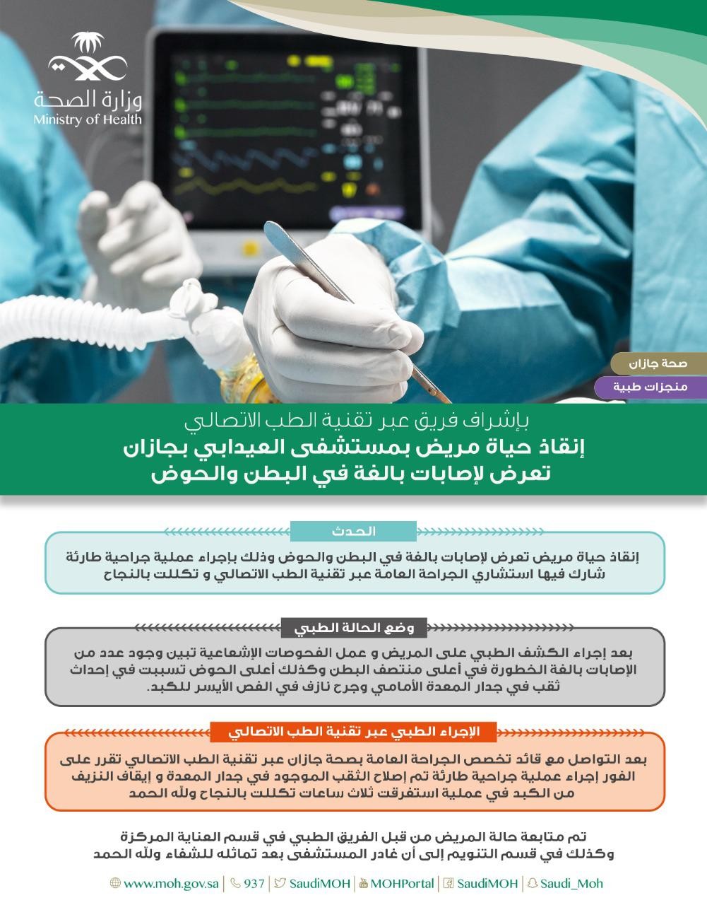 وأوضحت بأن المريض حضر الى قسم الطوارئ وبعد إجراء الكشف الطبي والفحوصات الإشعاعية تبين وجود عدد من الإصابات بالغة الخطورة في أعلى منتصف البطن وكذلك أعلى الحوض تسبب في إحداث ثقب في جدار المعدة الامامي وجرح نازف في الفص الايسر للكبد ، وبعد التواصل مع قائد تخصص الجراحة العامة بصحة جازان عبر تقنية الطب الاتصالي ، تقرر على الفور إجراء عملية جراحية طارئة تحت اشرافه المباشر لحظة بلحظة عبر تقنية الطب الاتصالي تم إصلاح الثقب الموجود في جدار المعدة وإيقاف النزيف من الكبد في عملية إستغرقت زمن ثلاث ساعات تكللت بالنجاح ولله الحمد .