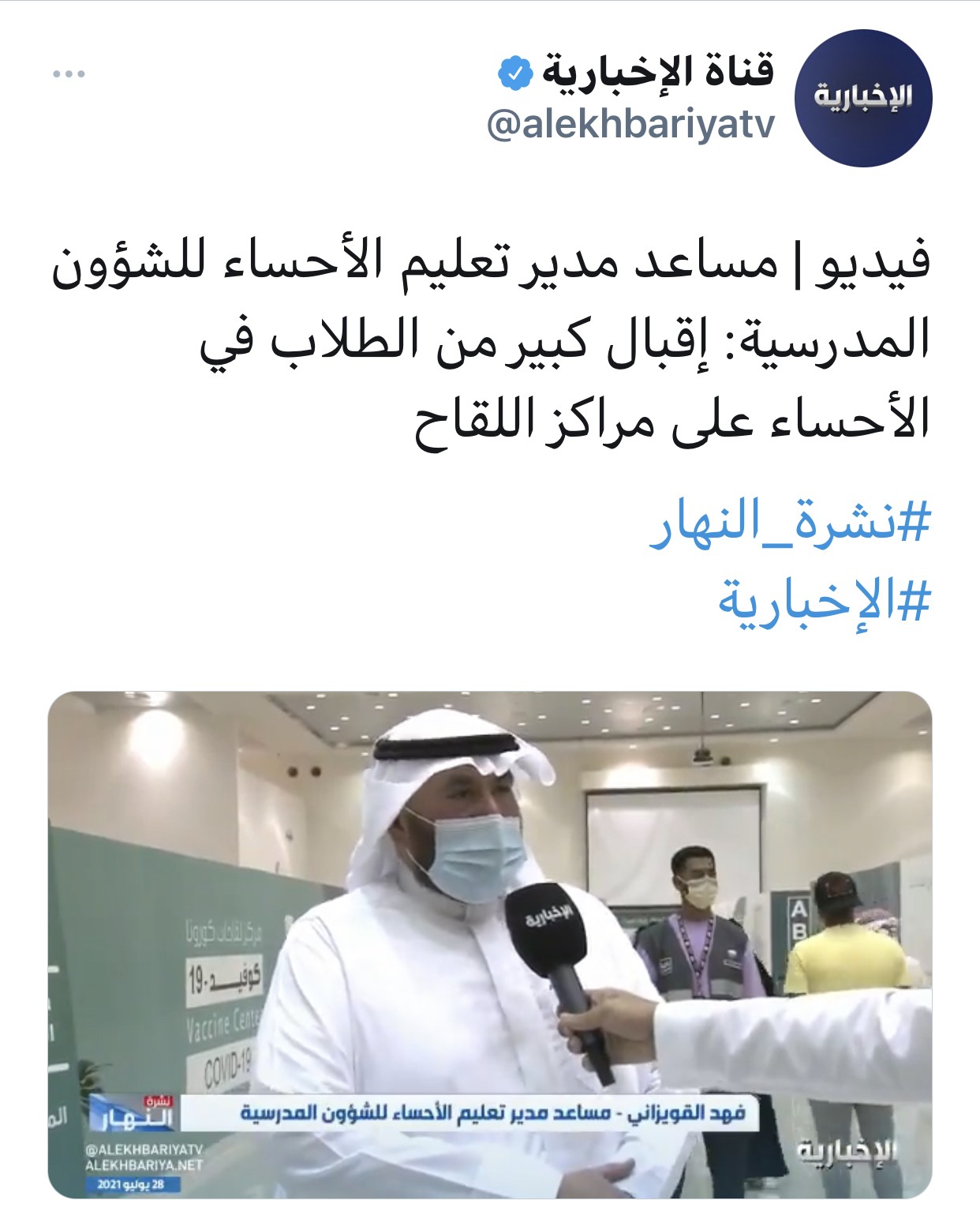 صرح مساعد مدير تعلم الأحساء للشؤون المدرسية "فهد القويزاني" بأن الإدارة العامة للتعليم بالأحساء سعت منذ صدور التوجيهات لاستهداف الفئة العمرية 12 – 18 عاماً، وبإشراف مباشر وشخصي من مدير الإدارة العامة للتعليم في محافظة الأحساء الدكتور "حمد بن محمد العيسى" ببذل كل الجهود لحث الطلاب والطالبات من هذه الفئة العمرية على تلقي لقاح كورونا، ونحن اليوم نشاهد بأم أعيننا كيف أن مراكز اللقاحات تكاد تكتظ بهم، جاء ذلك في تقرير عرضته قناة "الإخبارية".