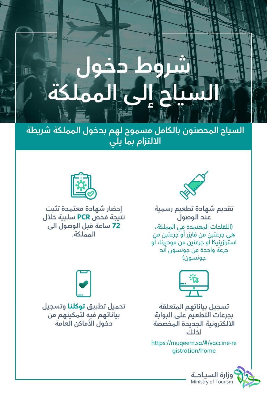 كما يتعين على زوار المملكة تسجيل بياناتهم المتعلقة بجرعات التطعيم على البوابة الإلكترونية الجديدة المخصصة لذلك “https://muqeem.sa/#/vaccine-registration/home”. كذلك تسجيل بياناتهم عبر تطبيق "توكلنا"، وإبرازه لدخول الأماكن العامة، علماً أن المحصنين بالكامل هم من تلقوا جرعتي تطعيم من أحد اللقاحات المعتمدة في المملكة، وهي فايزر أو استرازينيكا أو موديرنا، أو جرعة واحدة من جونسون آند جونسون.