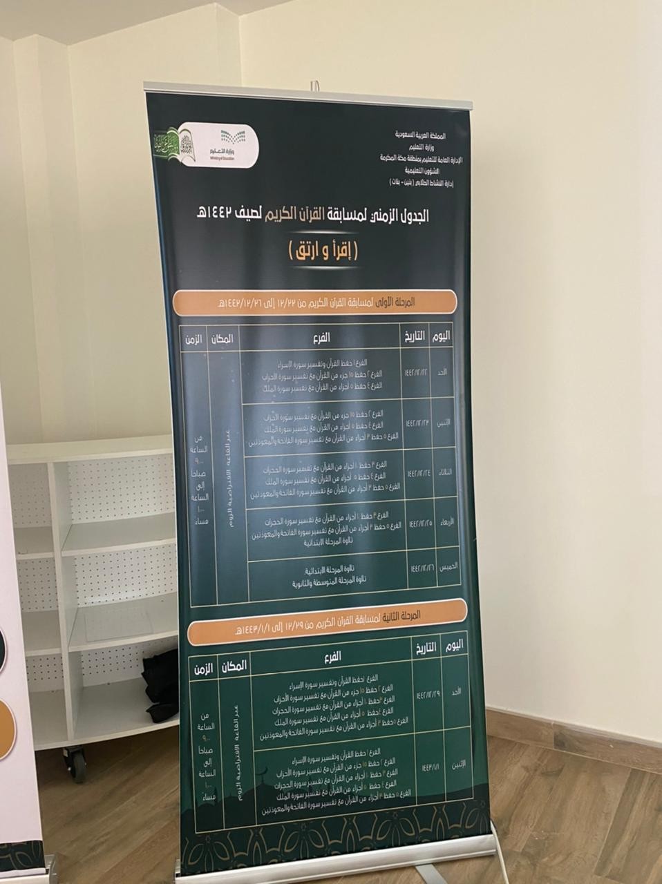 أطلقت الإدارة العامة للتعليم بمنطقة مكة المكرمة ممثلة بإدارة نشاط الطالبات فعاليات تصفيات مسابقة القرآن الكريم والسنة النبوية (اقرأ وارتق) و(وماينطق عن الهوى) للمرحلة الأولى، اليوم الأحد ٢٢ - ١٢ - ١٤٤٣ هـ، حيث تبدأ مرحلة التحكيم لكل من: الفرع الأول حفظ القران وتفسير سورة الإسراء، الفرع الثاني حفظ ١٥ جزء من القرآن مع تفسير سورة الأحزاب، الفرع الرابع حفظ أجزاء من القرآن مع تفسير سورة الملك. وفي الحديث النبوي الفرع الثالث حفظ ٢٥ حديثًا. وذلك بمقر مدارس الشيخ عبدالرحمن فقيه للبنات. بينما استهدف برنامج التصفيات طالبات المرحلة الثانوية والفرع الثاني طلاب وطالبات المرحلة الثانوية والمتوسطة.