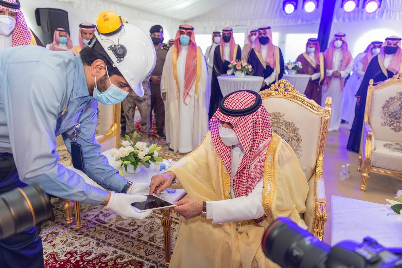 وفور وصول سموه دشن منظومة إنتاج الوجه للمياه المحلاة،و شاهد سموه والجميع عرضاً مرئياً عن المنظومة والتي تهدف إلى تعزيز أمن إمدادات المياه بالمحافظة والقرى المحيطة ونفذتها المؤسسة العامة لتحلية المياه المالحة بالمحافظة وبطاقة إنتاجية تصل إلى 25,500 متر مكعب من المياه المحلاة يومياً، , و تعمل بتقنية التناضح العكسي الصديقة للبيئة ذات الكفاءة والتنافسية العالية.