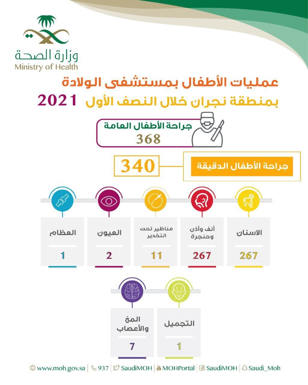 أجرى مستشفى الولادة والأطفال بنجران 708 عمليات جراحية للأطفال، وذلك خلال النصف الأول من العام 2021م.