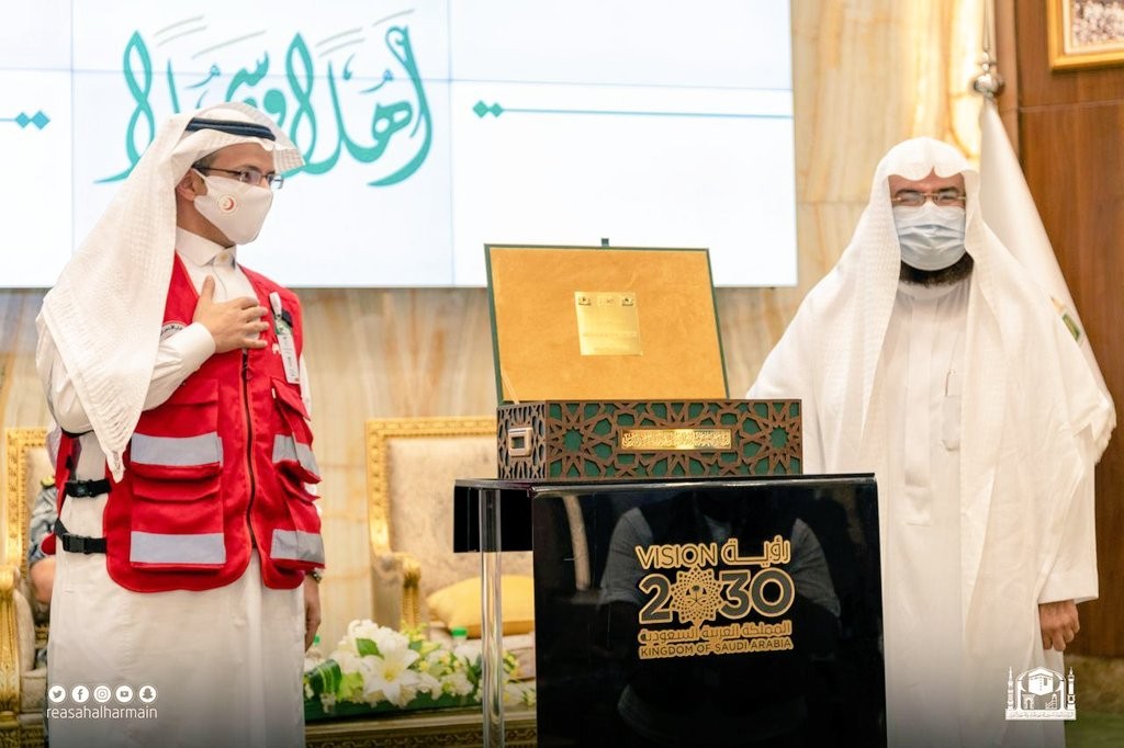 كرم الرئيس العام لشؤون المسجد الحرام والمسجد النبوي الشيخ عبدالرحمن بن عبدالعزيز السديس اليوم الخميس هيئة الهلال الأحمرالسعودي  في المسجد الحرام، وذلك نظير جهود الهيئة خلال موسم الحج الاستثنائي ٤٢ الذي أقيم مع  تطبيق كافة الإجراءات الاحترازية والوقائية لمكافحة  فايروس كورونا المستجد.