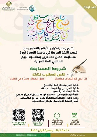 بمناسبة الاحتفال بلغة الضاد في اليوم العالمي للغة العربية وحرصا من جمعية كيان للأيتام ذوي الظروف الخاصة بتمكين مستفيديها الأيتام وتنمية مواهبهم وتمكينهم من الخط العربي بجميع أنواعه وأشكاله أطلقت الجمعية بالتعاون مع جامعة الأميرة نورة بنت عبد الرحمن ممثلة بقسم اللغة العربية مسابقة أفضل خط عربي ، والنص المطلوب كتابته هو: