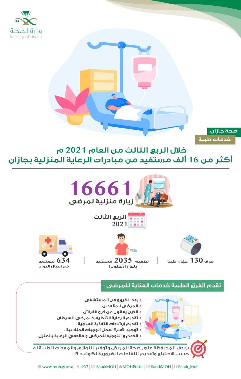 نفَّذت فرق الرعاية الصحية المنزلية بصحة جازان عدد " 16661 " زيارة منزلية للمرضى المستفيدين من الخدمة في جميع محافظات ومراكز المنطقة وذلك خلال الربع الثالث من العام الميلادي 2021 م