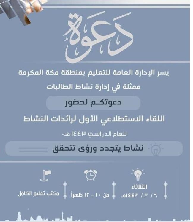 كما تم اليوم تنفيذ لقاء استطلاعي أول من قبل المكتب لرائدات النشاط بشعار "نشاط يتجدد ورؤى تتحقق" نفذته إدارة النشاط في إدارة التعليم - بنات - والذي استهدف بدوره رائدات النشاط لتكريم الموهوبات ومناقشة المستجدات.