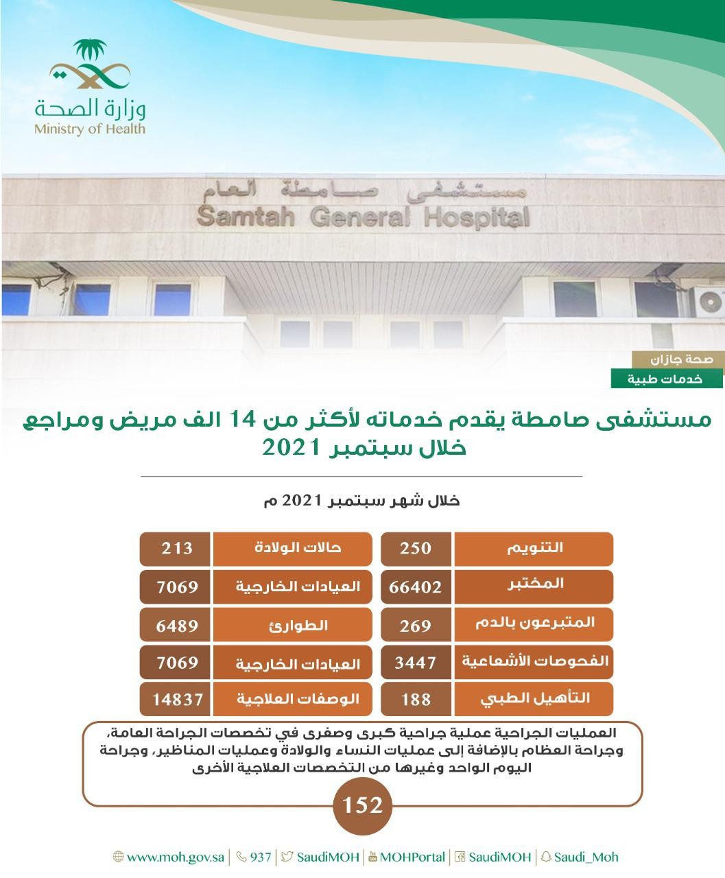 قالت صحة جازان بأن مستشفى صامطة العام قدم خدماته العلاجية لأكثر من " 14 ”ألف مريض و مراجع خلال شهر سبتمبر من هذا العام 2021 حيث بلغ عدد مرضى قسم الطوارئ "6489" مريض ، في حين بلغ عدد المراجعين بالعيادات الخارجية "7069 ” مراجع .