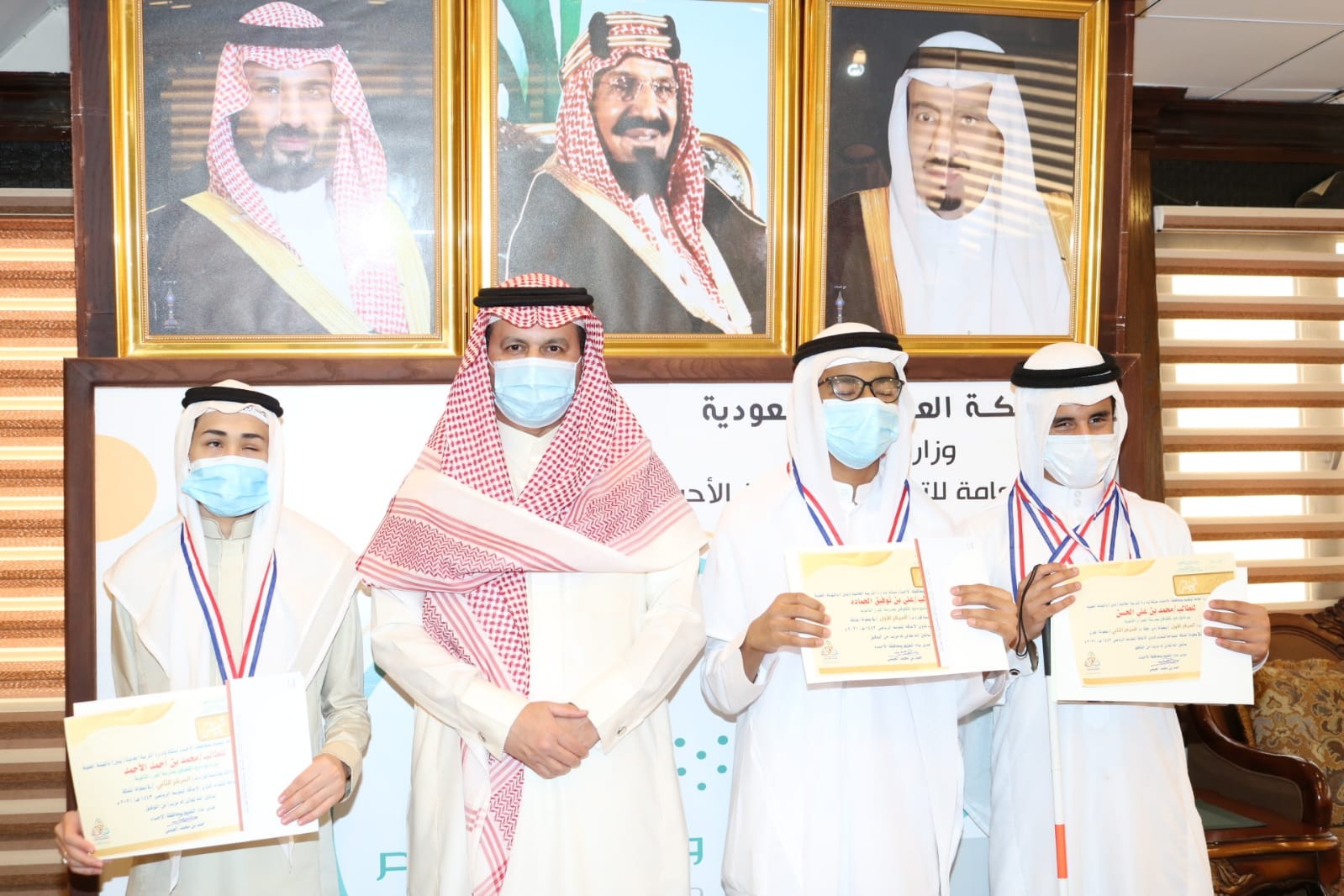 وكرم مدير إدارة تعليم الأحساء حمد العيسى في مكتبه الثلاثة طلاب المكفوفين، ونقل لهم تهاني وتبريكات وزير التعليم الدكتور حمد آل الشيخ وأمنياته لهم بتحقيق مزيداً من البطولات على المستوى المحلي والدولي، كما تم تكريم طلاب العوق البصري الفائزين على مستوى المملكة وذلك بمناسبة اليوم العالمي للعصا البيضاء 2021م.