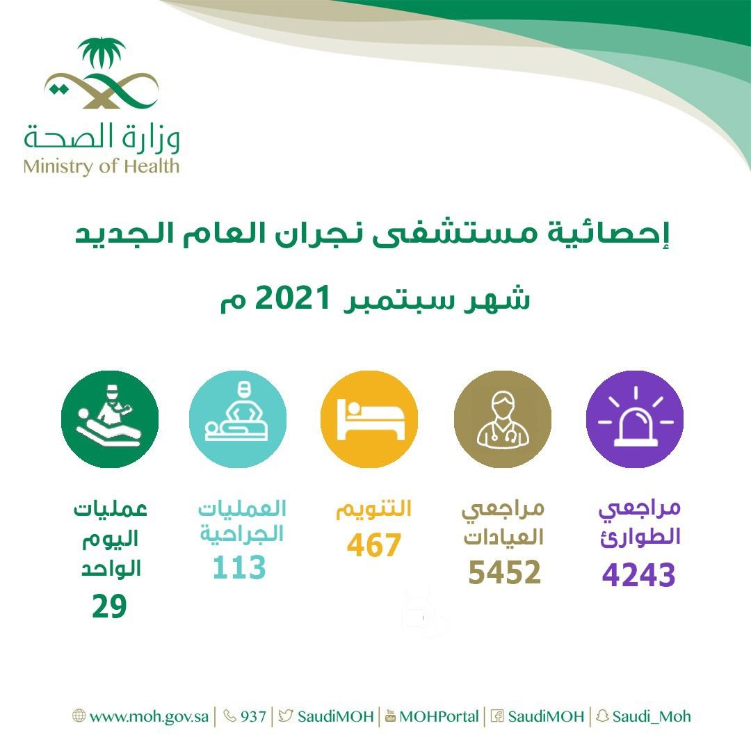 قدمت أقسام الطوارئ والعيادات في مستشفى نجران العام الجديد الخدمات العلاجية والاستشارية لـ9695مستفيدًا ، وذلك خلال شهر سبتمبر العام الجاري 2021م وأوضحت (صحة نجران) أن عدد المستفيدين من قسم الطوارئ في المستشفى بلغ 4243 مراجعًا، فيما بلغ عدد مراجعي العيادات 5452 مراجعًا، مضيفة أن إجمالي عدد المنومين بلغ 467 مريضًا، وإجراء 142 عملية جراحية ، منها 29 عملية لجراحة اليوم الواحد.