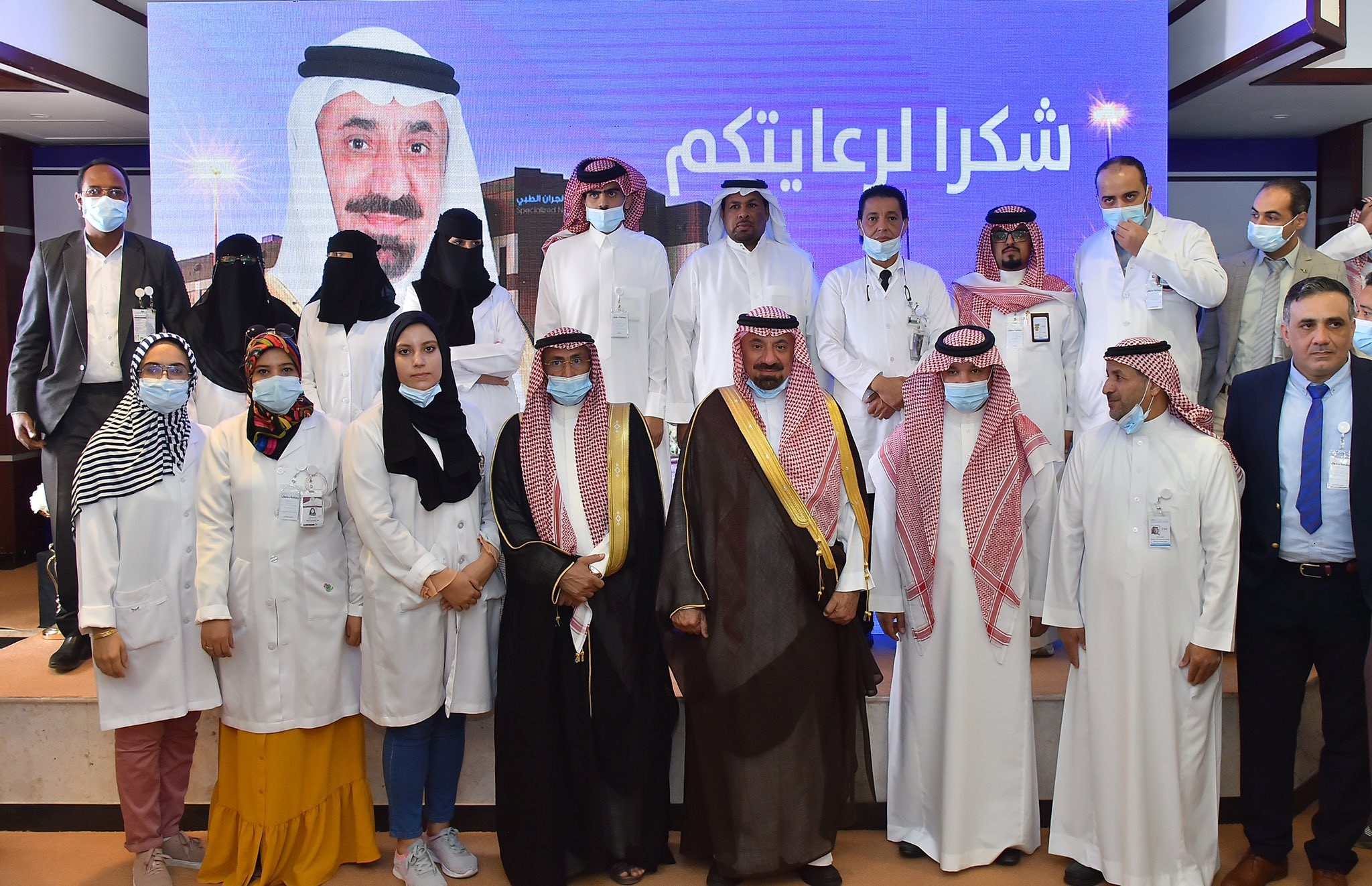 وكرّم سمو أمير منطقة نجران الأطباء المتميزين وفريق العدوى بالمستشفى لجهودهم خلال جائحة كورونا، كما التقط سموه صورة تذكارية مع منسوبي المستشفى.