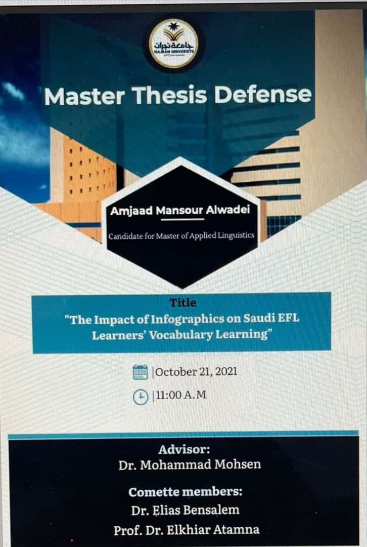 حصلت الأستاذة أمجاد منصور مسفر آل عامر الوادعي على درجة الماجستير بتقدير "ممتاز" مع مرتبة" الشرف الأولى" في تخصص "اللغة الإنجليزية" من جامعة نجران في رسالتها والتي كان عنوانها "تأثير الرسوم البيانية على تعلم مفردات متعلمي اللغة الإنجليزية كلغة أجنبية في السعودية".