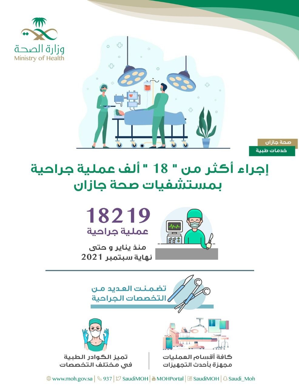 أجرت أقسام الجراحة بصحة جازان " 18219 " عملية جراحية للمرضى منذ بداية يناير وحتى نهاية شهر سبتمبر من العام " 2021 " م .