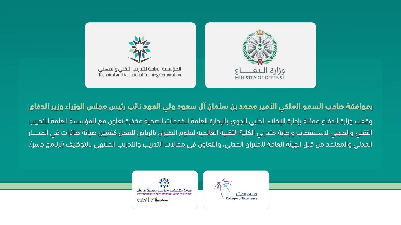 بناءً على موافقة صاحب السمو الملكي الأمير محمد بن سلمان بن عبد العزيز ولي العهد نائب رئيس مجلس الوزراء وزير الدفاع وقعت وزارة الدفاع ممثلة بإدارة الإخلاء الطبي الجوي بالإدارة العامة للخدمات الصحية أمس بالرياض مذكرة تعاون مع المؤسسة العامة للتدريب التقني والمهني لاستقطاب ورعاية متدربي الكلية التقنية العالمية لعلوم الطيران بالرياض للعمل كفنيين صيانة طائرات في المسار المدني والمعتمد من قبل الهيئة العامة للطيران المدني، والتعاون في مجالات التدريب والتدريب المنتهي بالتوظيف (برنامج جسر).