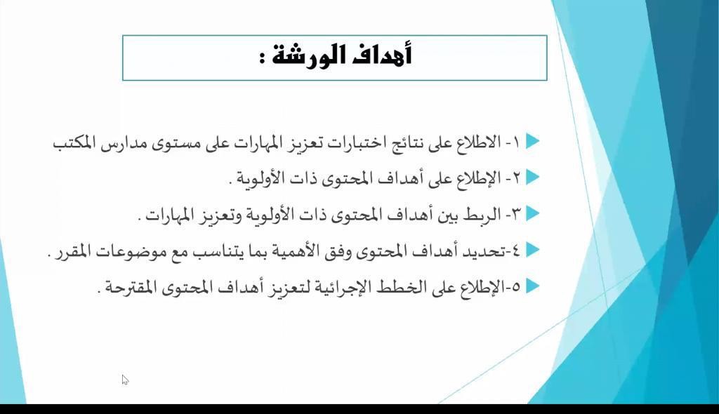 استهدفت الورشة ٢٣٠ معلمة من معلمات العلوم بجميع المراحل وذلك بهدف تعزيز أهداف المحتوى ذات الأولوية والاطلاع على نتائج اختبارات تعزيز المهارات على مستوى مدارس المكتب، والاطلاع على أهداف المحتوى ذات الأولوية ، والربط بين أهداف المحتوى ذات الأولوية وتعزيز المهارات، تحديد أهداف المحتوى وفق الأهمية بما يتناسب مع موضوعات المقرر واستعراض الخطط الإجرائية لتعزيز أهداف المحتوى.
