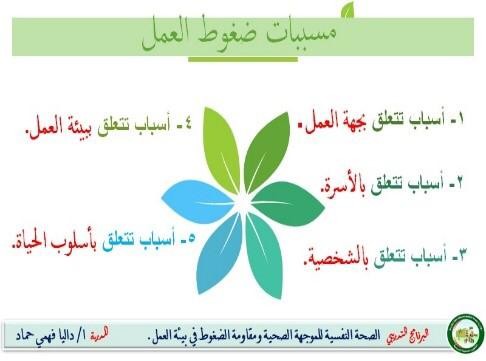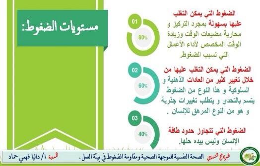 كما ناقش العديد من المحاور منها: التعرف على مفهوم ضغوط العمل ومكوناتها ومستوياتها وأسبابها، وأساليب التعامل معها، وكيفية مقاومة الضغوط وتحويلها إلى محفزات للعمل، ومضيعات الوقت في بيئة العمل، وأعراض التوتر والتأثير السلبي لضغوط العمل على الصحة النفسية والجسم، وضغوط العمل التي تواجه الموجهة الصحية، وتأثيرها على مستوى الأداء الوظيفي، وشرح أشهر التقنيات في إدارة المهام والوقت المعينة في إدارة عمل الموجهة الصحية، و أهم الحيل التي تساعد في التخفيف من التوتر وضغوط العمل (التمارين الرياضية واتباع نظام غذائي).