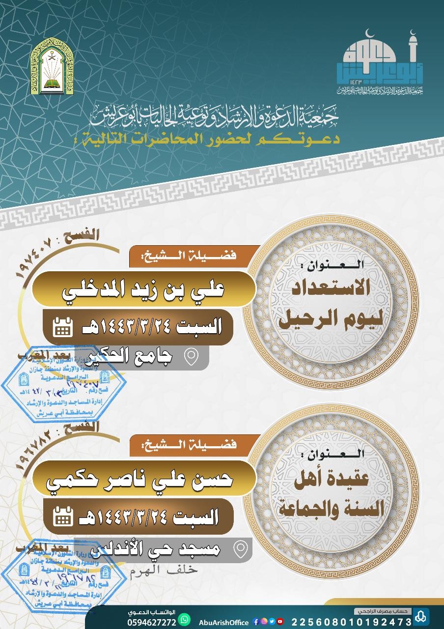 نفّذَ فرع وزارة الشؤون الإسلامية والدعوة والإرشاد في منطقة جازان بالتعاون مع جمعية الدعوة والإرشاد وتوعية الجاليات بمحافظة أبو عريش مساء السبت الموافق 24 / 3 / 1443 هـ , تحدث فيها فضيلة الشيخ علي بن زيد المدخلي عن " الاستعداد ليوم الرحيل " وذلك في جامع الحكير كما تحدث أيضاً فضيلة الشيخ حسن بن علي الحكمي عن " عقيدة أهل السنة والجماعة " وذلك بمسجد حي الأندلس .