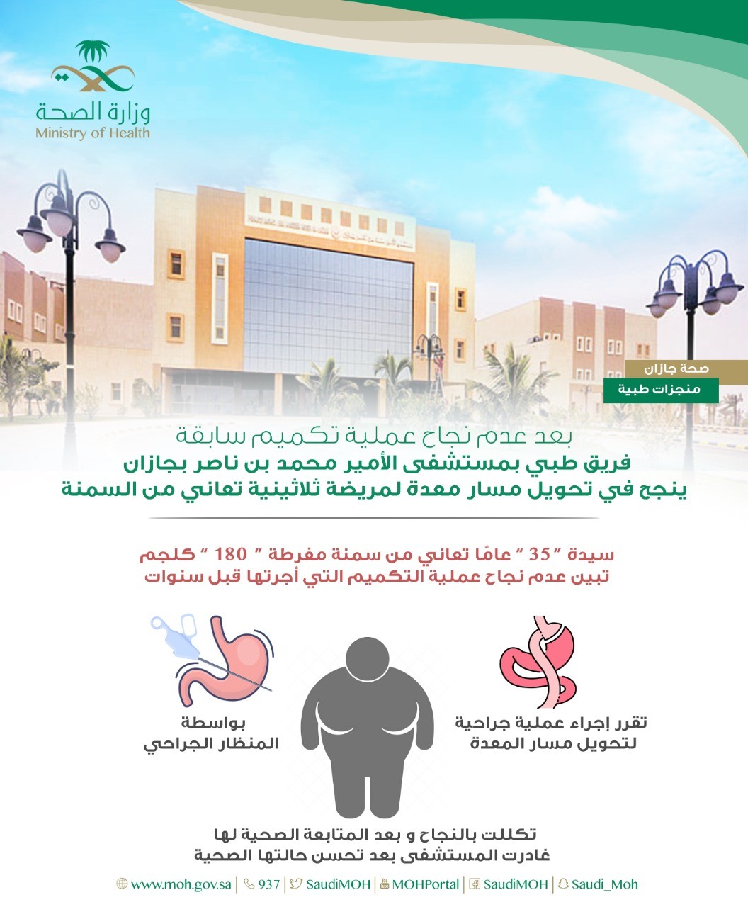 أوضحت صحة جازان بأن فريق طبي بمستشفى الأمير محمد بن ناصر نجحوا في إجراء أول عملية لتحويل مسار المعدة بواسطة جهاز المنظار الجراحي لمريضة ثلاثينية تعاني من سمنة مفرطة بوزن " 180 " كيلو جرام .