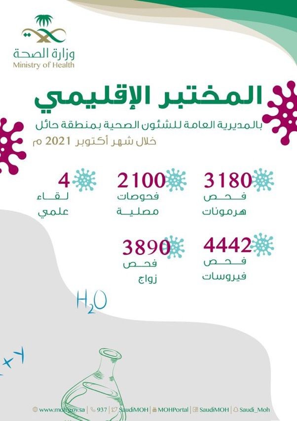 أجرى المختبر الإقليمي بصحة منطقة حائل خلال شهر أكتوبر من هذا العام 2021م “3180” فحص هرمونات، و”4442″ فحصاً للفيروسات، و”3890″ فحص زواج، و”2100″ فحصًا مصليًّا، كما نفذ 4 لقاءات علمية.