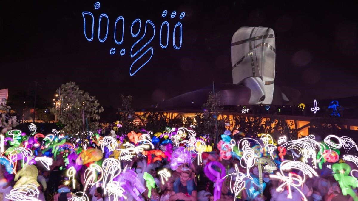 وتنوعت الأشكال الفنّية بين حروف أسماء الزّوار، وأخرى بنمط موحّد لحركة اليد وتلويح الأجهزة الذكيّة لرسم خطوط موازية ذات تعبير فنّي منظّم، فيما كانت الطائرات من فوقهم تحلّق لترصد المشهد وتنقله لعتمة السماء لتتلألأ النجوم وتعانق الفنّ الرقمي.