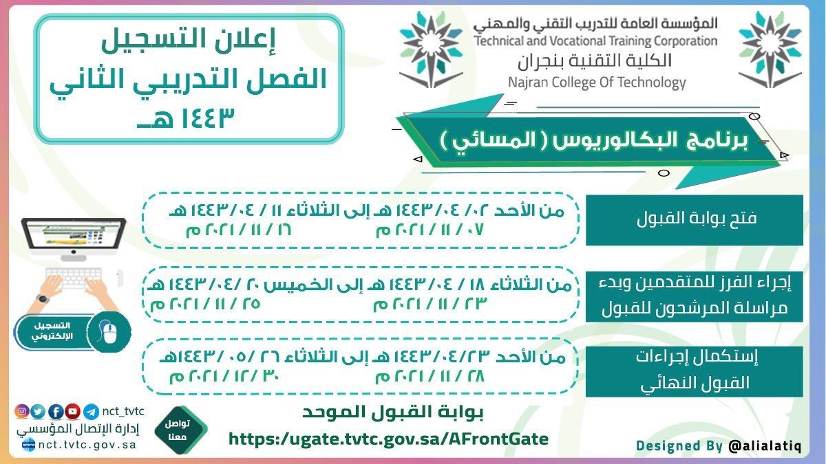بدأت الكلية التقنية بنجران استقبال طلبات القبول في برنامج البكالوريوس المسائي للفصل التدريبي الثاني من العام التدريبي 1443 هـ حيث سيكون التسجيل متاحاً حتى يوم الثلاثاء من شهر ربيع الأول وذلك عبر موقع بوابة القبول الموحد https:/ugate.tvtc.gov.sa/AFrontGate.
